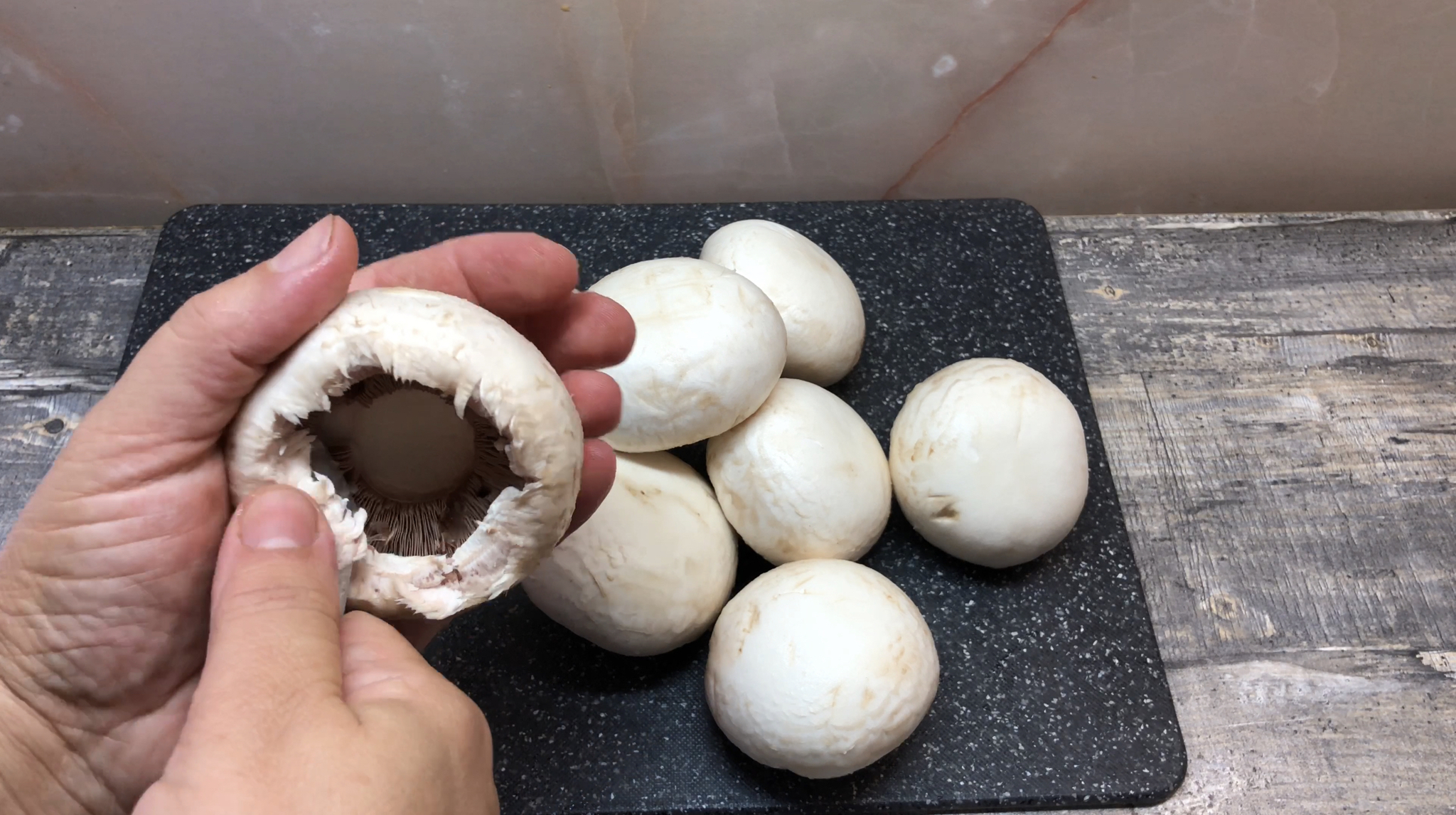 1) Отрываем ножки от шампиньонов и нарезаем их как показано на видео