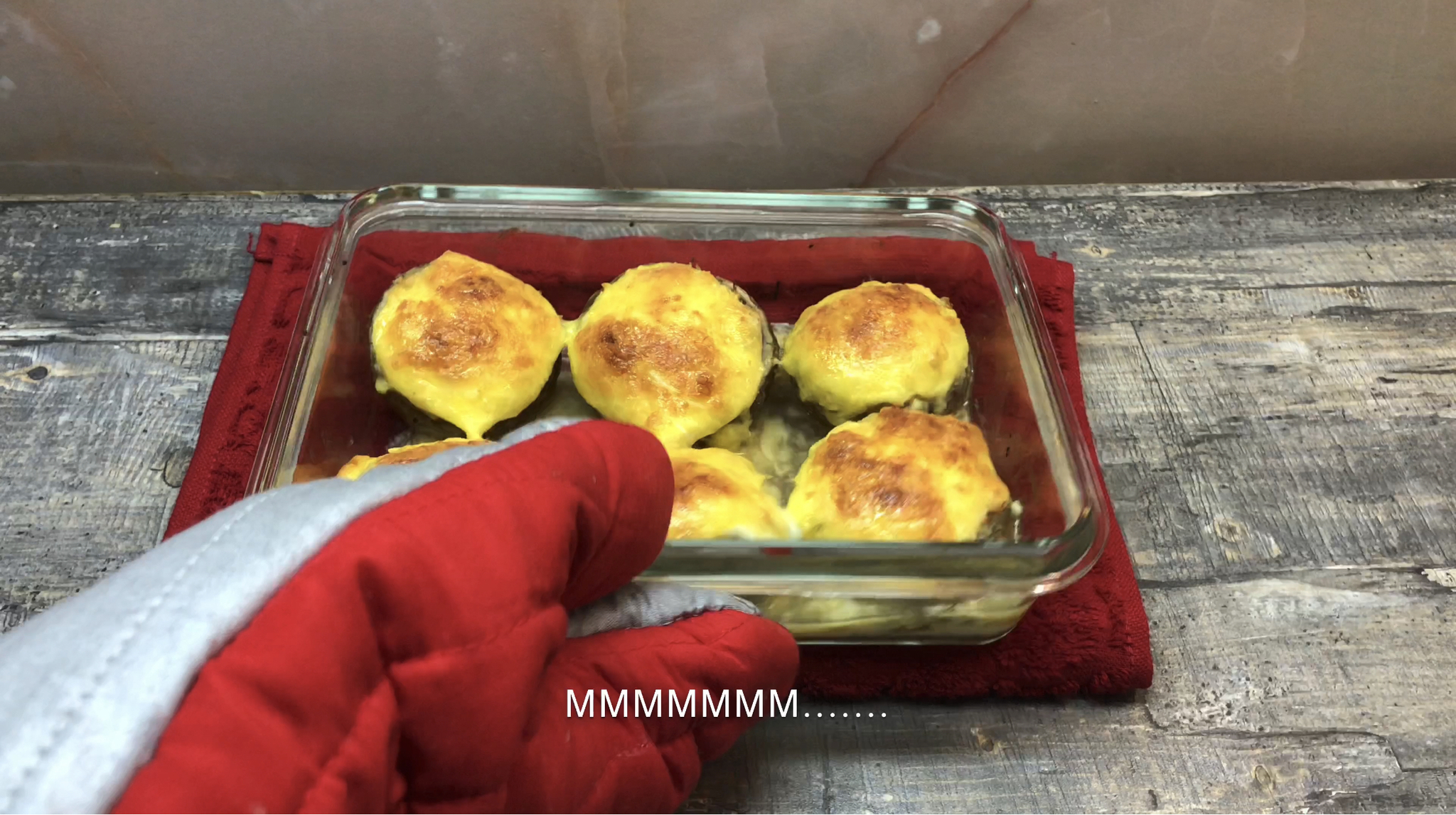 8) Кладём в шапки от грибов мясную начинку и добавляем содержимое нашей миски