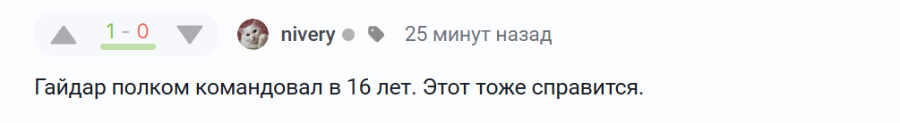 Не покидает меня лёгкое чувство кринжа, когда вижу 18-летнего орденоносца, командующего седовласыми старцами. Ну ладно, не все там седовласые. Такие мотивы я видел в кино, где молодой отрок на троне судьбы вершит. Допускаю, что он умней и опытнее их всех, вместе взятых, но вероятность эта меньше моих шансов выиграть миллиард баксов в лотерее.