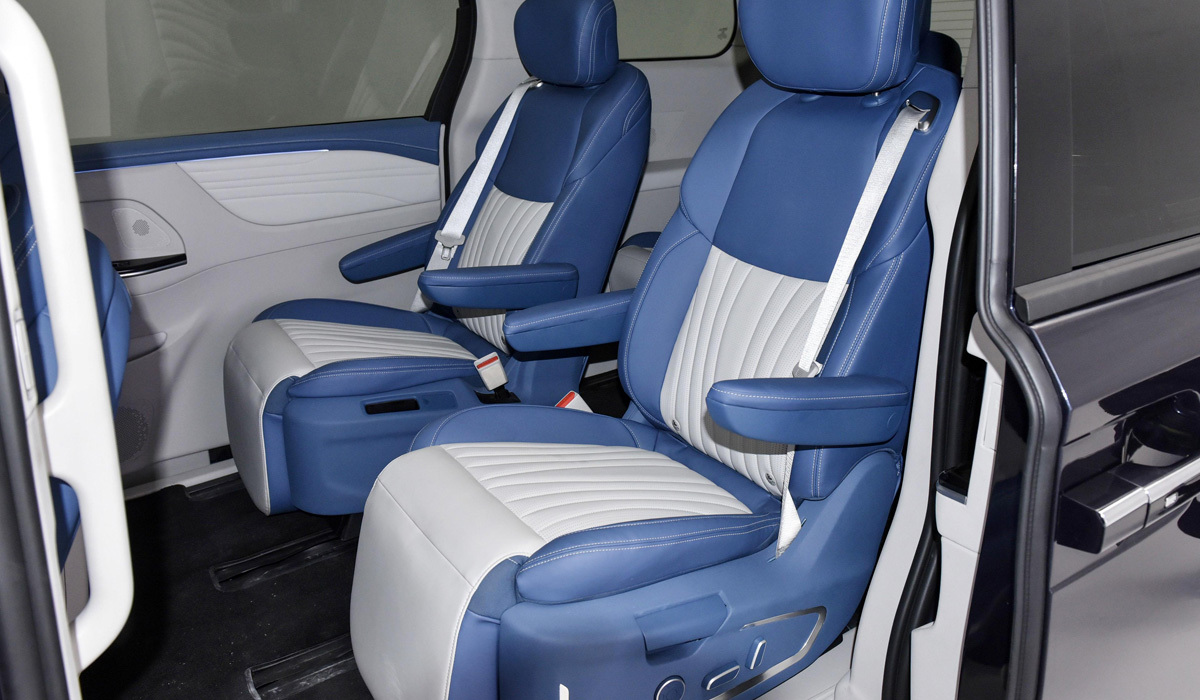 Белый минивэн с вертикальными прутьями решетки радиатора — это базовая версия без электродовеска. У нее двухлитровый бензиновый турбомотор (252 л.с., 400 Нм), восьмиступенчатый «автомат» и передний привод. Передняя панель — с объединенными в широком корпусе экранами приборов и медиасистемы, а в салоне семь посадочных мест. Раздельные кресла второго ряда имеют электропривод, обогрев и индивидуальные подлокотники, позади них — простой трехместный диван.