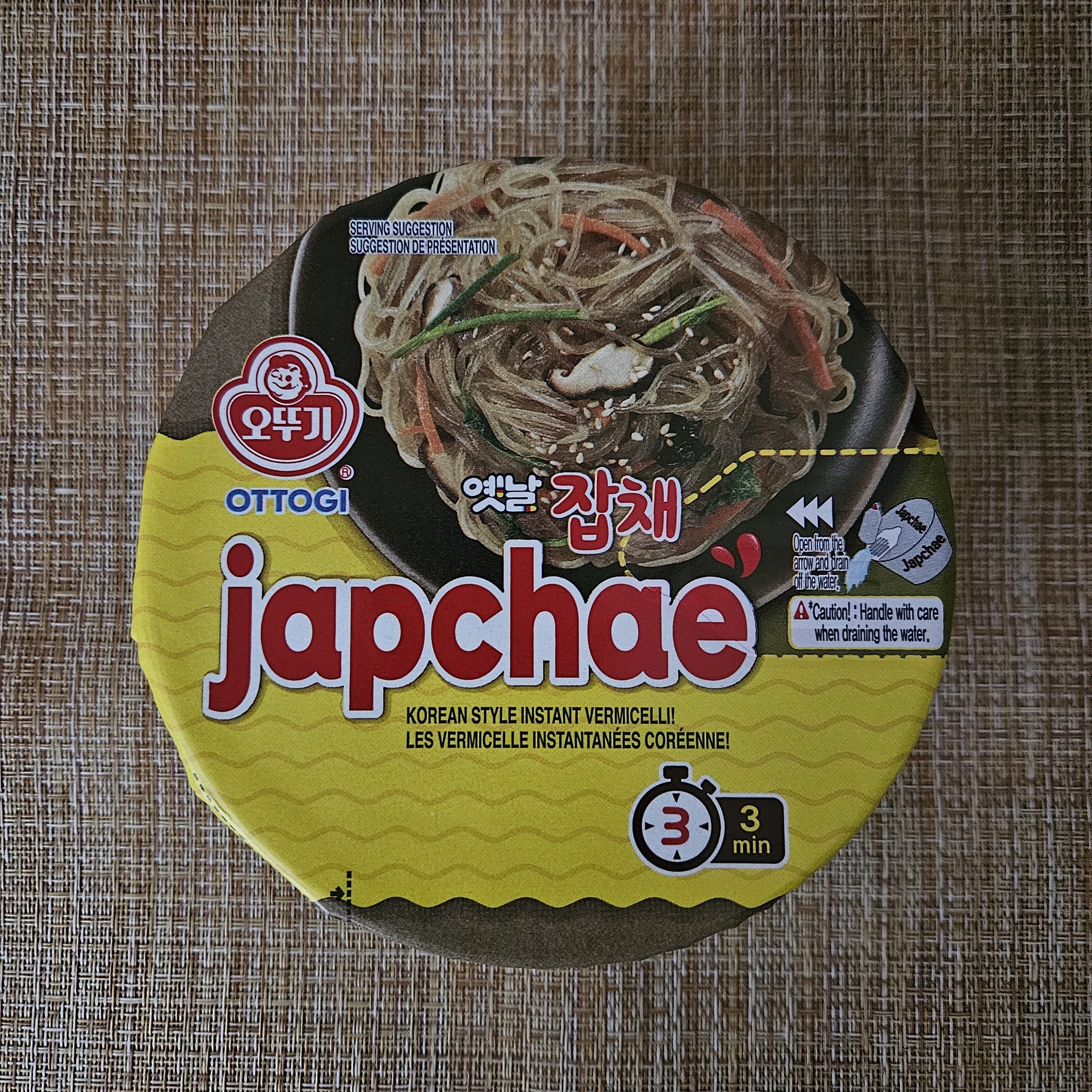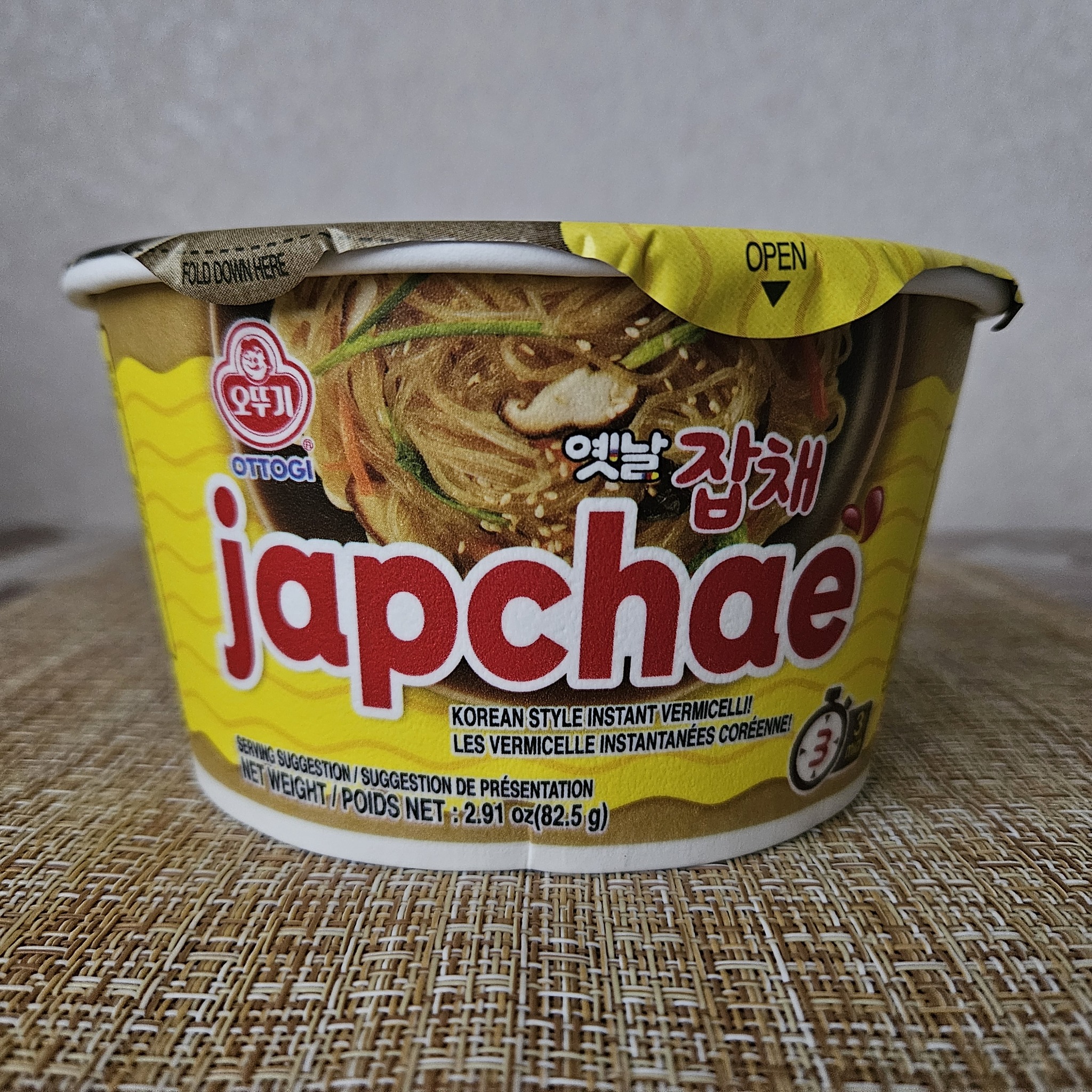 Здравствуйте, дорогие любители лапши! Сегодня представляю вам Лапшу под названием Чапче. Производитель – всем нам известный корейский Ottogi. Лапша приобретена на Озоне за 184 рубля. Упаковка в формате низкой чашки с мягким верхом. Цвета, традиционно, оттогиевские, жёлтые. Для ЛЛ: неплохо, но не огонь. На упаковке имеется информация на английском и французском языках. Впрочем, есть и русскоязычный стикер.