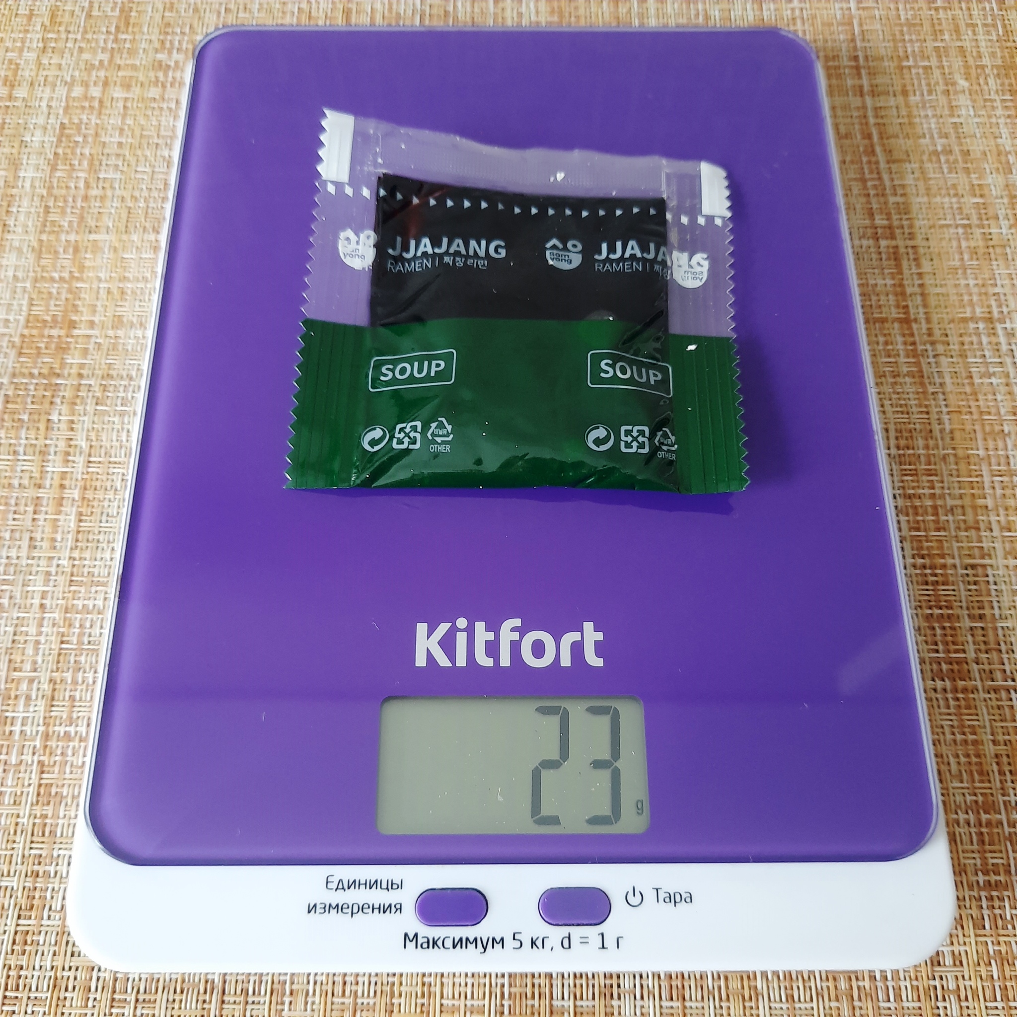 Но вернемся к нашему подопытному. Внутри пакета находим брикет лапши и пакетик с соусом. Масса лапши составила 63 грамма. Сама лапша выглядит нетипично для Samyang. Она бледная, толстая, волнистая.
