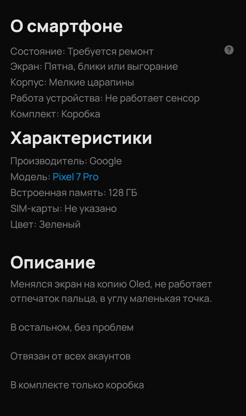 Здравствуйте товарищи пикабушники. Хочу поделиться опытом покупки б\у техники, а именно смартфона Pixel 7 Pro на авито, у человека по имени Сметанин Николай, он же под именем JK-Service на Авито. Хочу предостеречь от покупок у этого человека и спросить совета, как его наказать? В общем был куплен сматрфон, в описании было указано, что экран меняный и с пятном, не работает датчик отпечатка пальца. Другие косяки не были указаны, точнее было написано, что в остальном все Ок с телефоном.