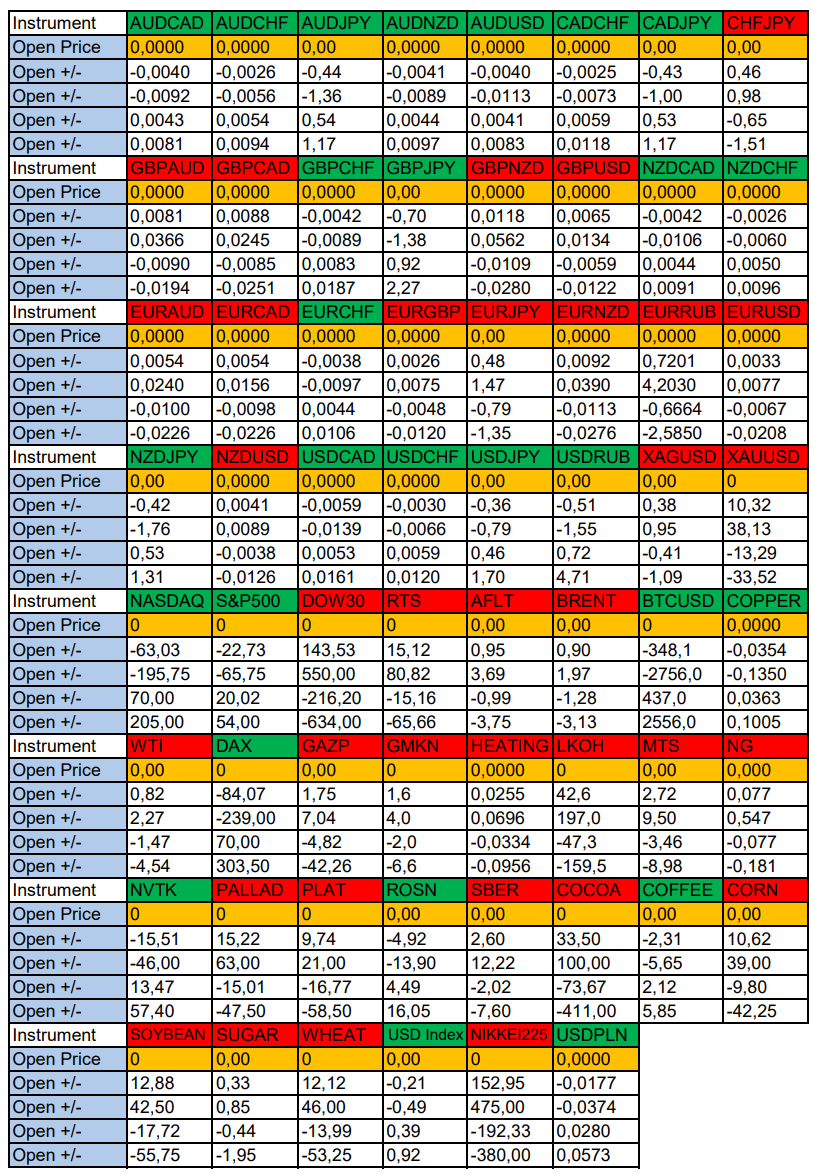 Весь перечень анализируемых активов указан ниже в общем количестве 62 инструмента. Здесь Вы найдете активы рынка Форекс, популярные активы Московской биржи, не менее популярные активы Чикагской биржи СМЕ и мажор криптовалютного сегмента - Биткоин, за которым следуют все альткоины.