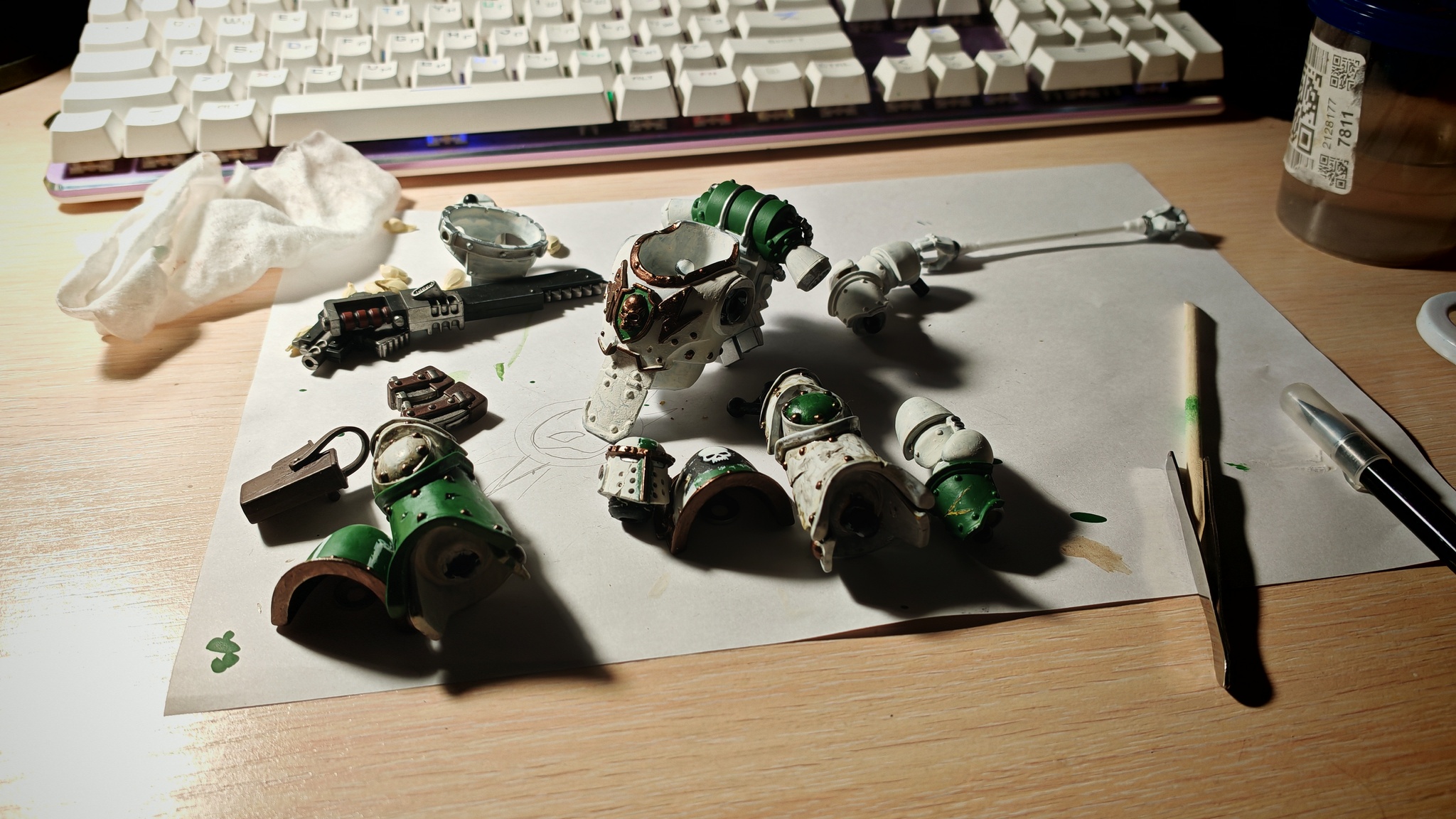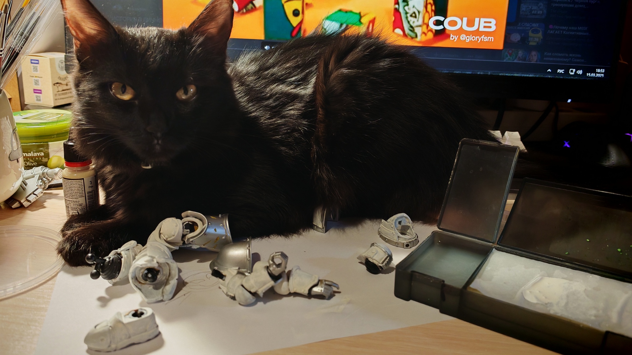 Страшный фелинид бдит за процессом. Видна расчлененка, часть поверхностей еще не покрашена и видна грунтовка.