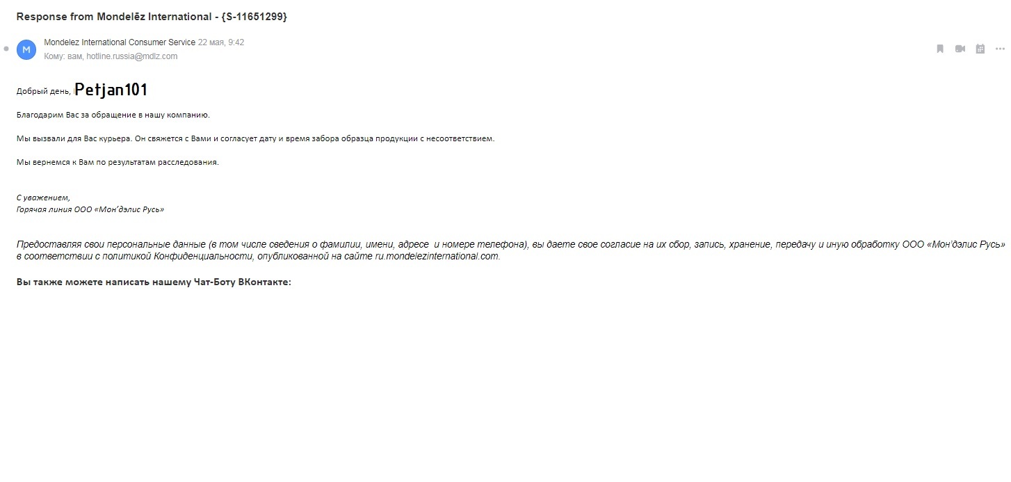 Боль в зубе не утихала и я разозленный данным фактом, решил позвонить на горячую линию компании ООО «Мон’дэлис Русь» указанной на упаковке. На том конце провода девушка очень вежливо меня выслушала, принесла словесные извинения, записала мои контактные данные и сказала, что со мной свяжутся в скором времени. Коллеги посмеивались: - что толку то, выкинь да и все!