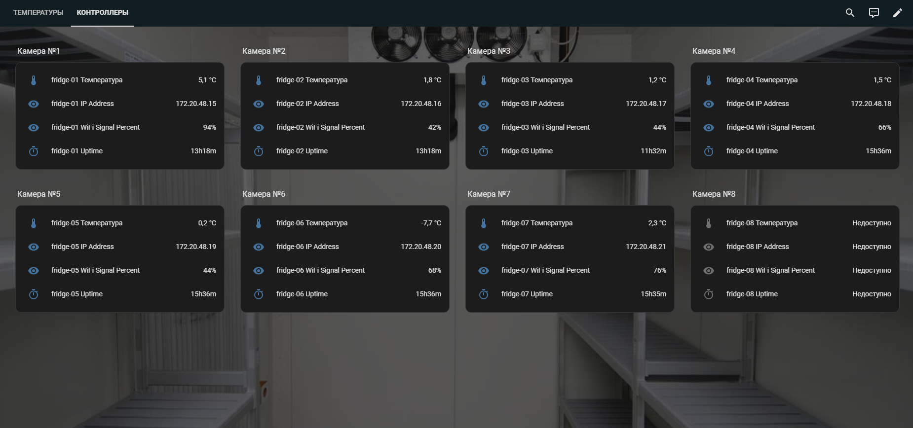 Раскидываем это все по холодильникам, подключаем к питанию в обычные 220. И все. Теперь мы можем смотреть за холодосами и что там творится.