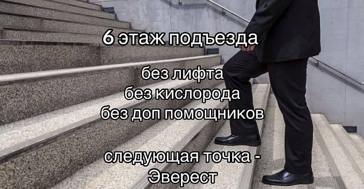 18 VerhovniyMemolog Юмор для всех и каждого Юмор К новым вершинам! 3 месяца назад Телеграм - Три мема внутривенно Юмор Картинка с текстом Мемы Высота Эверест Ступеньки Подъезд Telegram (ссылка) 1 Ещё 0