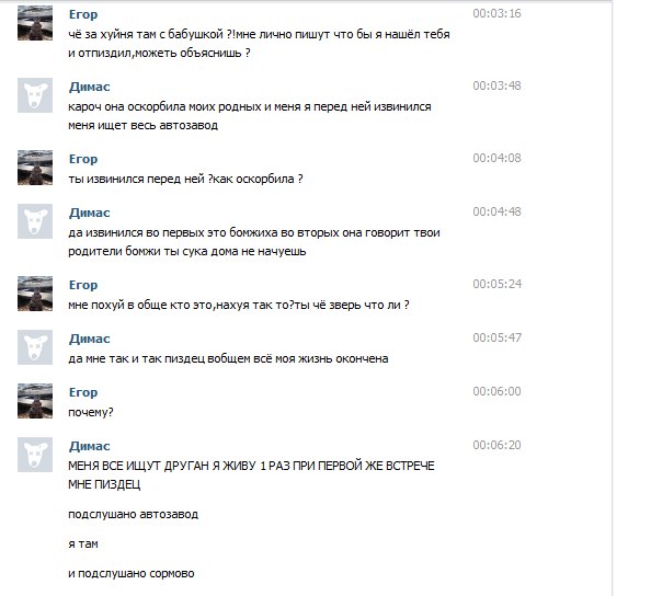 ну как он сказал она оскорбила его родителей, назвала его и их бомжами,то что он дома не ночует и вроде все Он написал что выходить боится так как если выйдет то все с ним