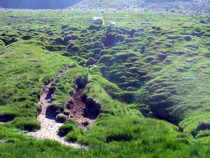 Типичный ландшафт равнин в Исландии сегодня. Тонкий плодородный слой частично поврежден осадками, частично приподнят замерзшими грунтовыми водами и осадками. Да-да, тот самый пасторальный исландский пейзаж – такой же признак экологической катастрофы, как и условный «Рыжий лес», как бы нельзя было их сравнивать.