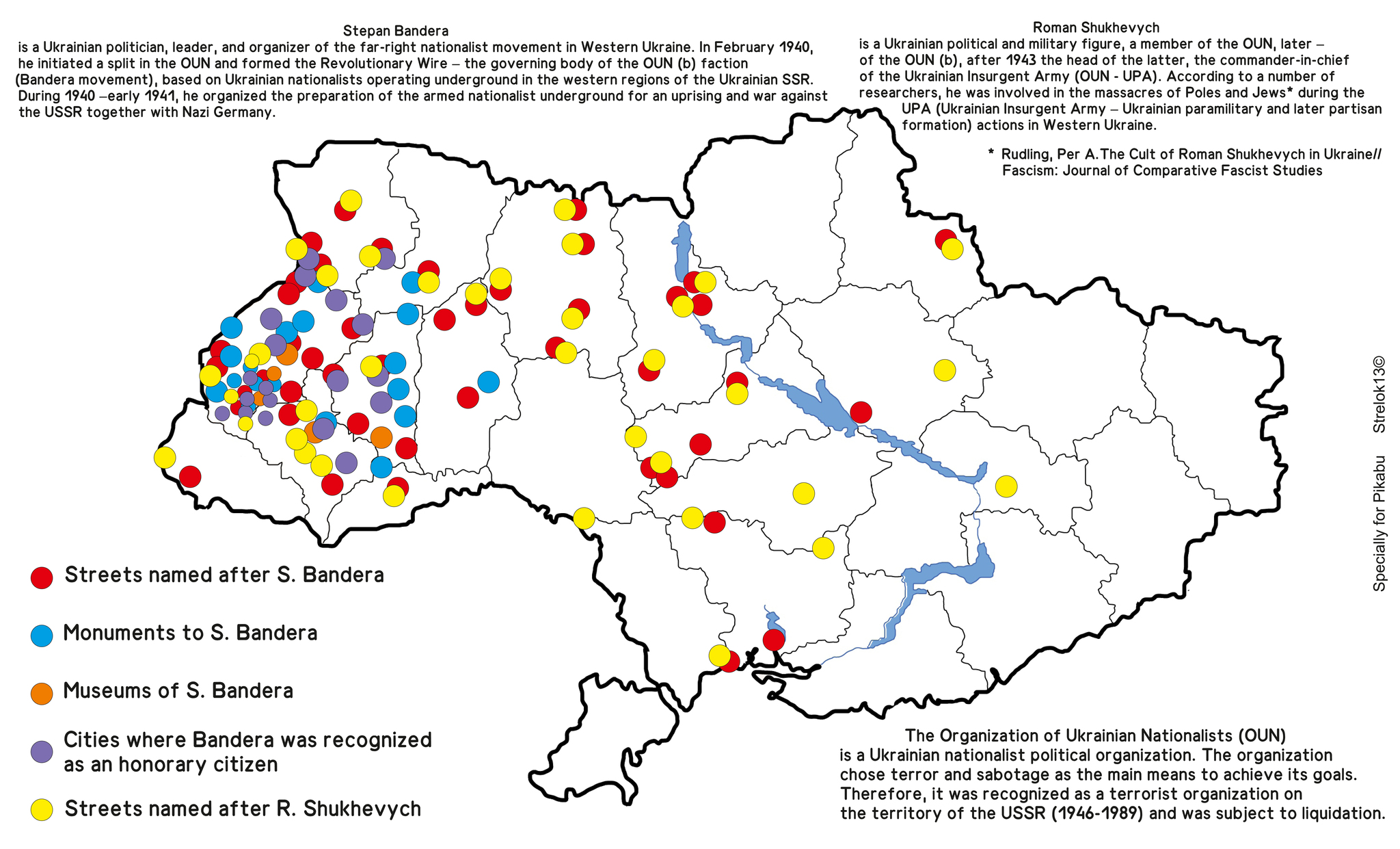 Не хотел лезть в политоту, но давно самому было интересно собрать на одной карте все улицы, музеи и прочую героизацию Бандеры и Шухевича, просто что бы глянуть как оно рассредоточено по регионам Украины.