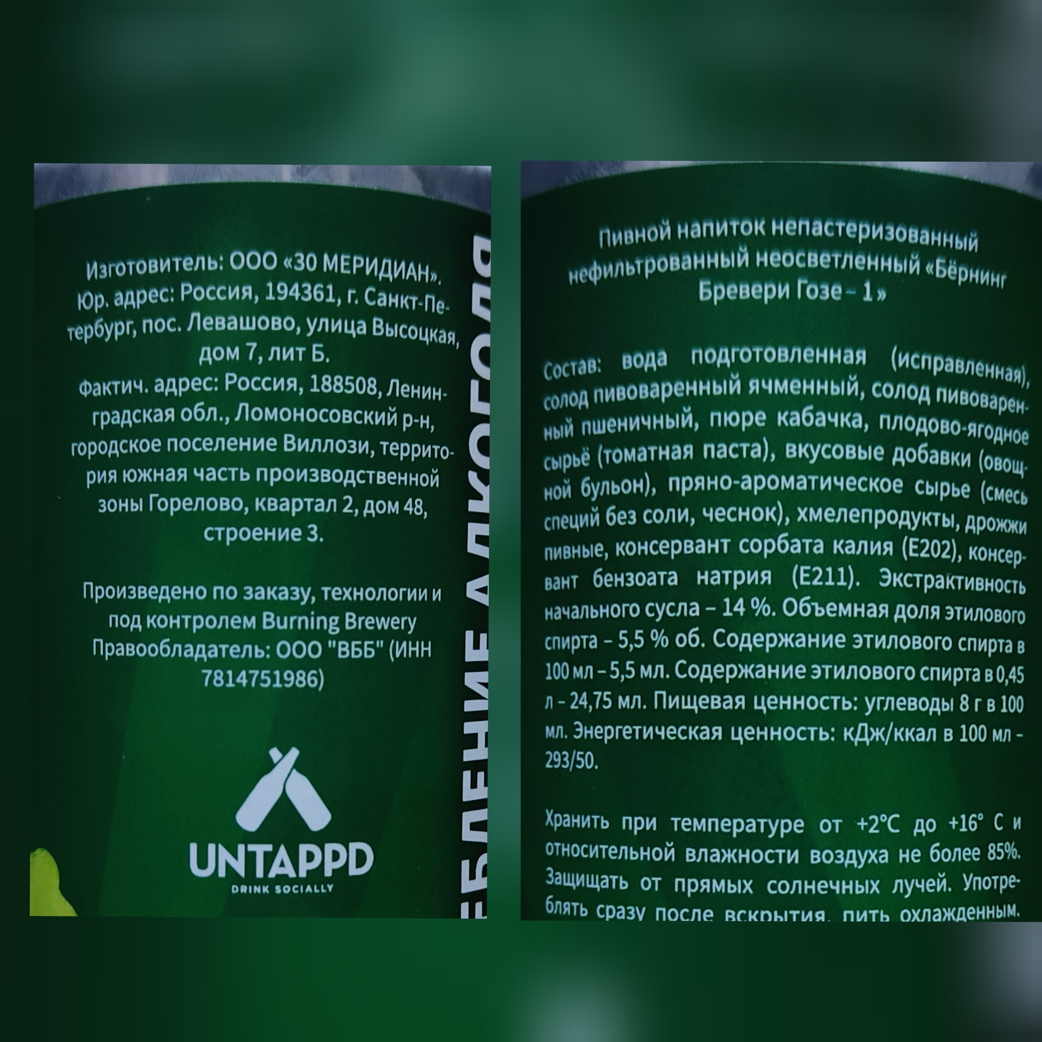 Пивной напиток, нефильтрованный, непастеризованный, неосветленный "Бёрнинг гозе - 1"