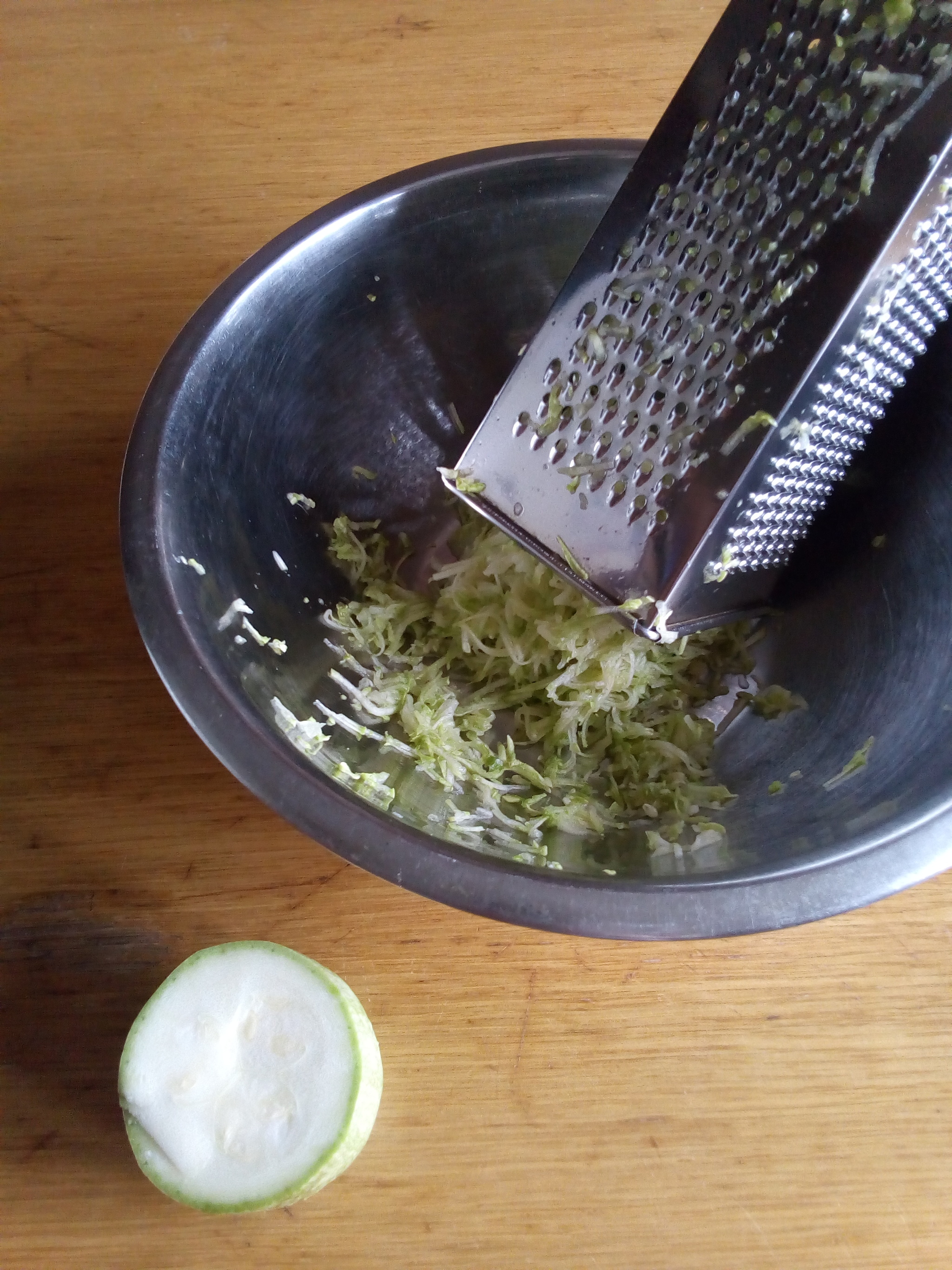 Натереть в тару кабачок на мелкой тёрке. Добавить муку, яйцо, соль.