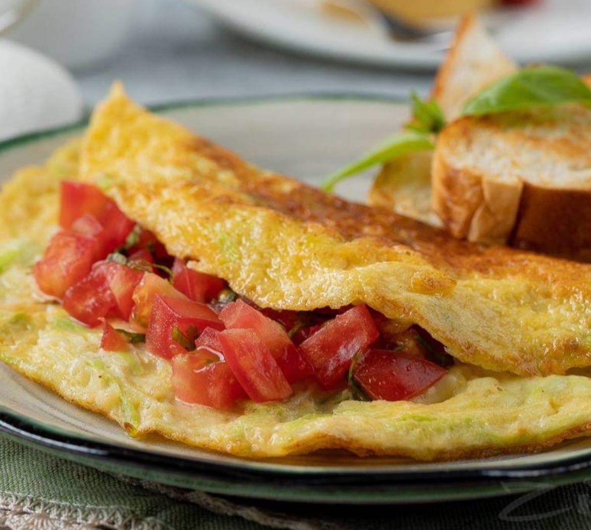 5. Готовый омлет переложить на тарелку. Выложить на половинку помидоры, накрыть второй половинкой, сразу подавать.