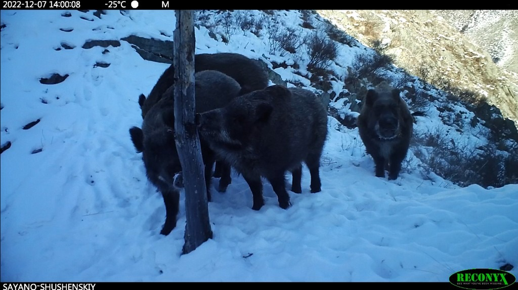 «Кабаны попали в кадр на горном хребте вблизи ручья. Вероятно, они переходили через этот хребет вниз к ручью. Когда мы пошли проверять фотоловушку, то видели кабанью тропу, по вытоптанной на снегу тропе было очень удобно подниматься до места установки фотокамеры. Внизу, в пойме ручья расположены большие поляны, которые были все вытоптаны и перекопаны кабанами», – рассказывает начальник научного отдела Роман Афанасьев.