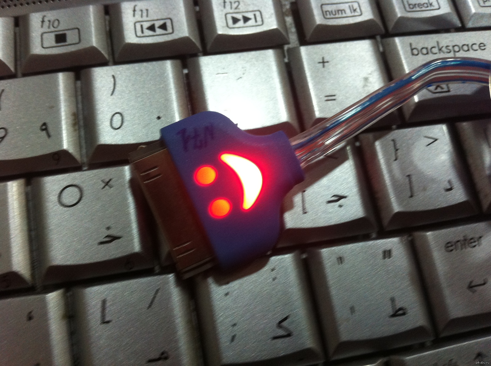 moslero 11 лет назад Кабель? ДА ты упорот! Купил USB кабель для телефона, подключил и увидел это. В темноте смотрится забавно. [моё] Кабель iPhone Упоротость