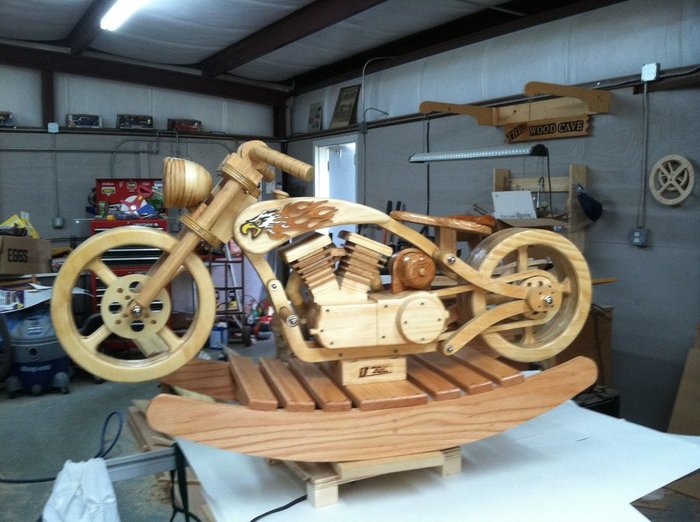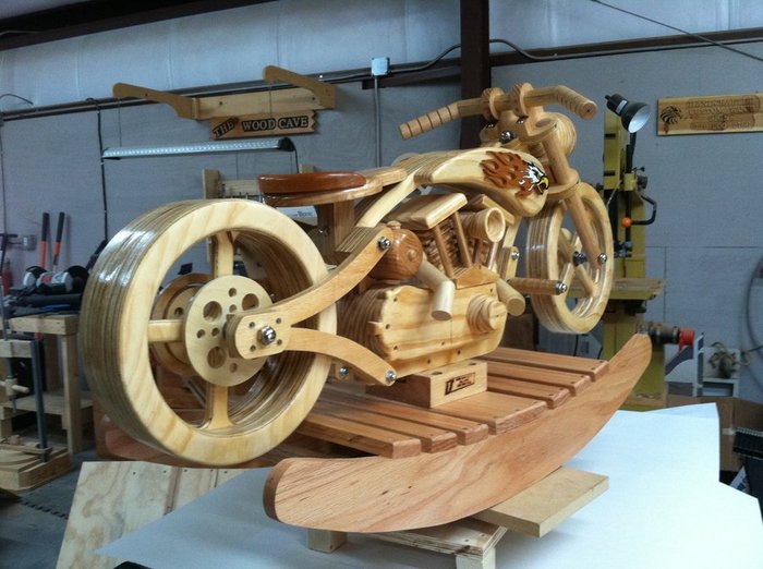 357 cabaye Транспорт Качалка-байк 8 лет назад Bill Quitman изготовил эту качалку для своего внука на Рождество. Ремесло Работа с деревом Столяр Мото Игрушки Длиннопост