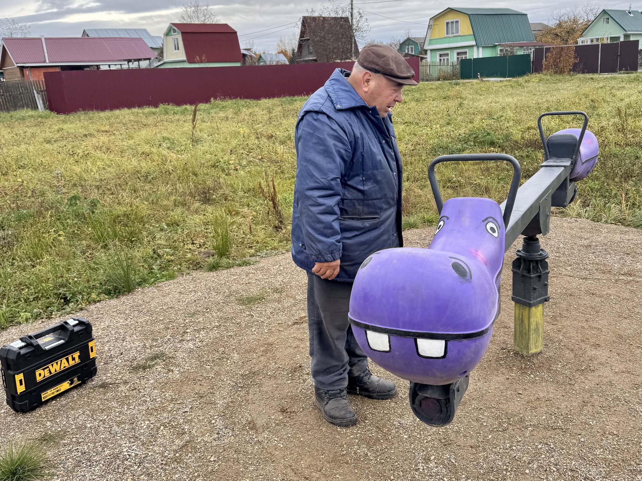 Качель - бегемот, теперь вновь на своём месте, после модернизации, сделали опорные элементы под сиденьями.