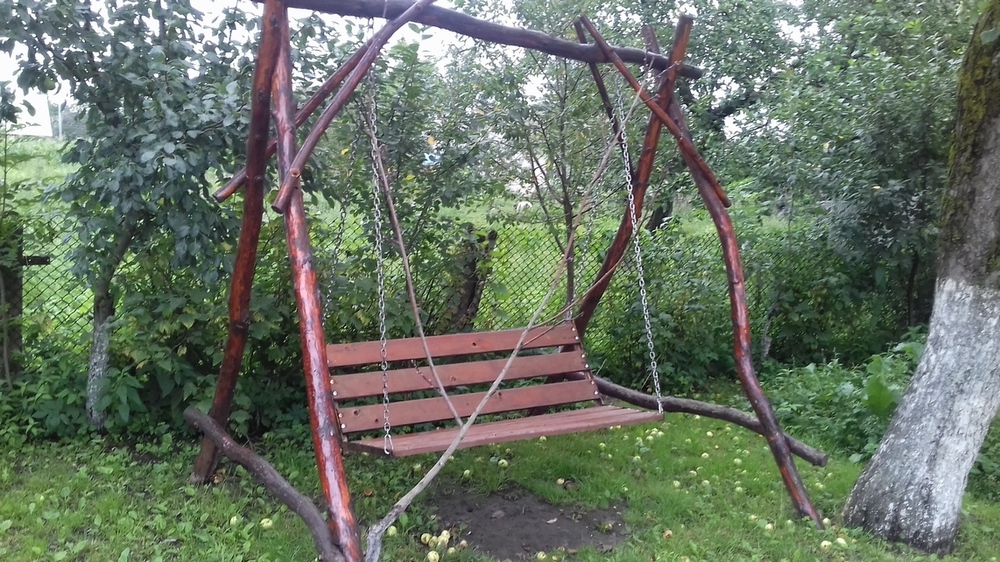 На такой и при желании сильно не раскачаешся, сиденье не то. Я специально такое сделал чтобы сильно можно было раскачиватся. Качели с двухместным сиденьем у меня есть металлические на них енот и сидит))