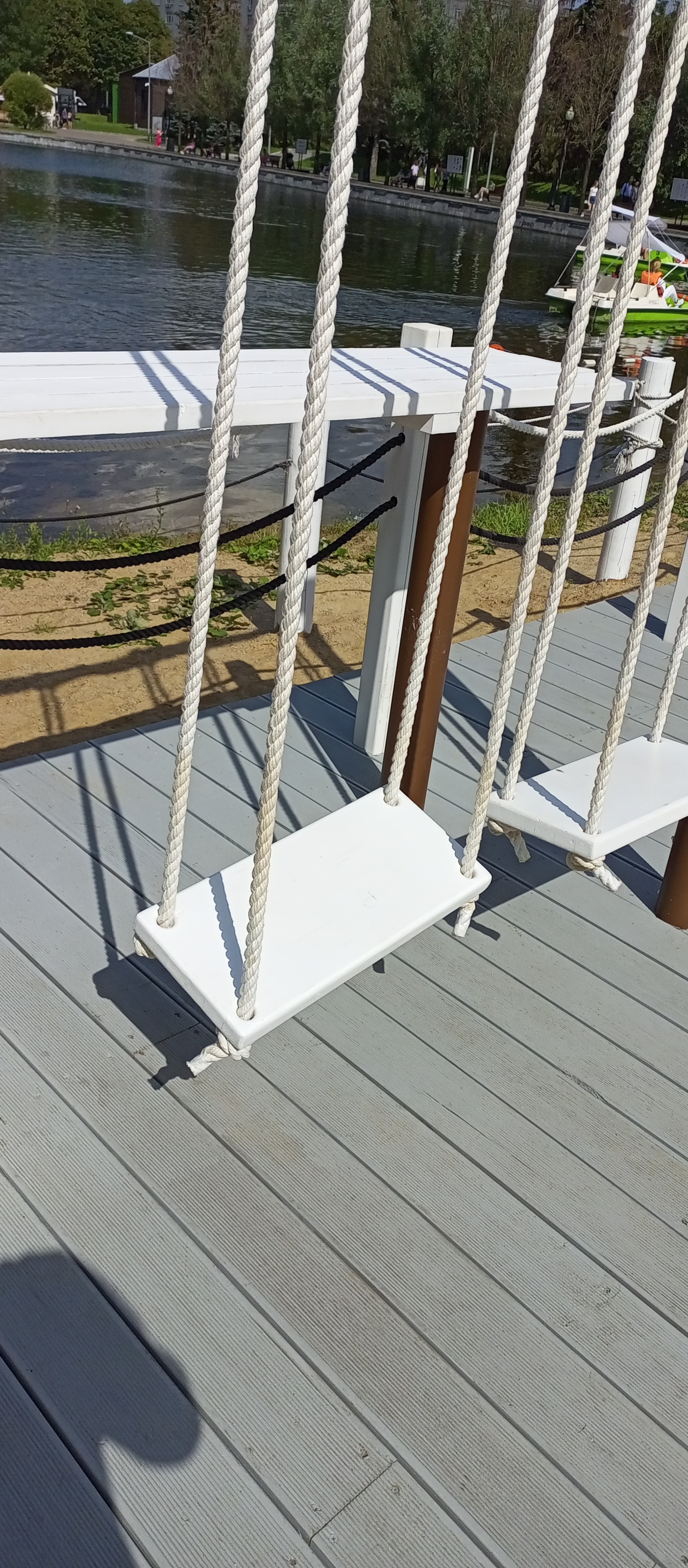 1. есть качели и стол. на качелях, как собственно эта часть парка больше для детей - не покачаться. головой в стол удариться. Взрослому не сесть - стол на уровне лица-шеи -груди. даже мне, ростом 180+ низко