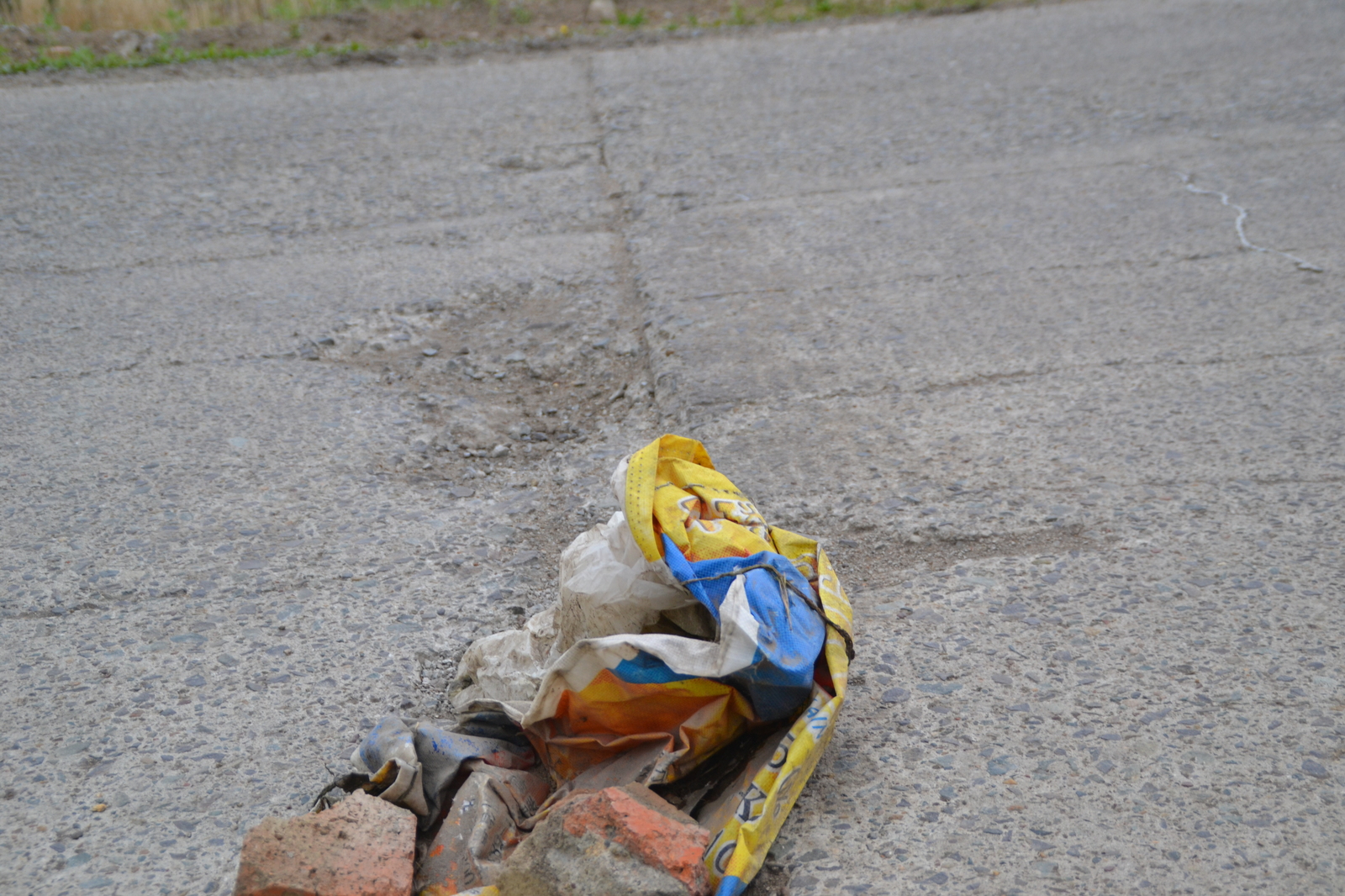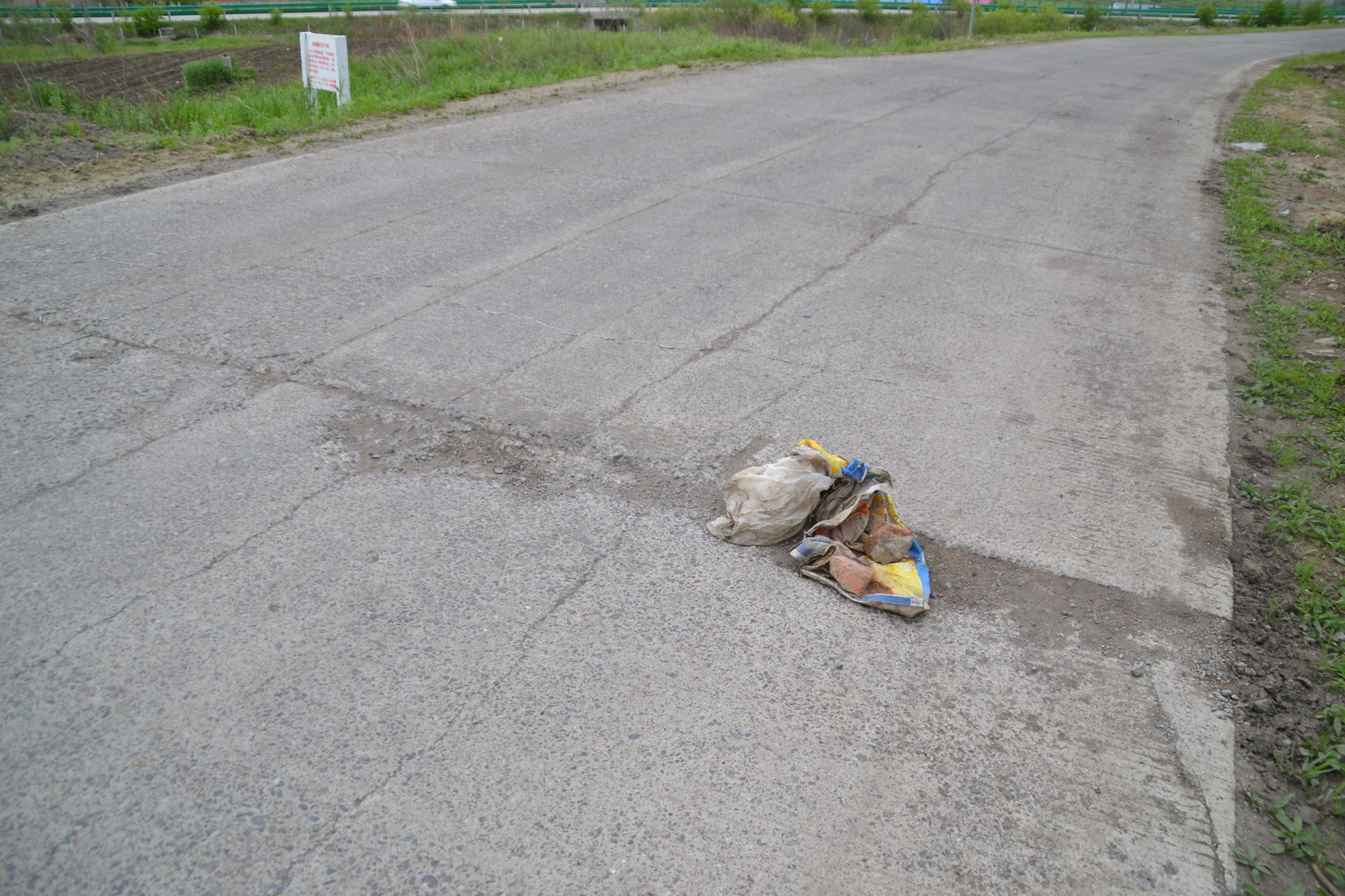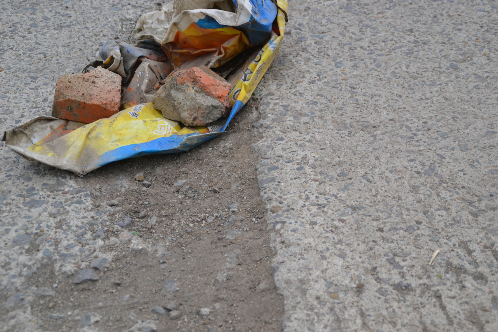 Забавно смотрятся кирпичики и кусок баннера, заботливо уложенных в выбоину каким-то странным человеком. Хорошо что вовремя увидел и не нарвался на них.