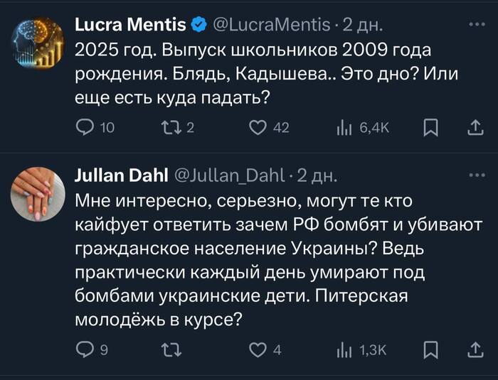 5359 Donskiedela Кадышева. Родина соевого страха23 5 месяцев назад Скриншот X (Twitter) Либералы Выпускной Политика Двойные стандарты Длиннопост Мат Россия и Украина Русофобия Волна постов Надежда Кадышева 967 173 12 8 4 3 2 2 Ещё 3