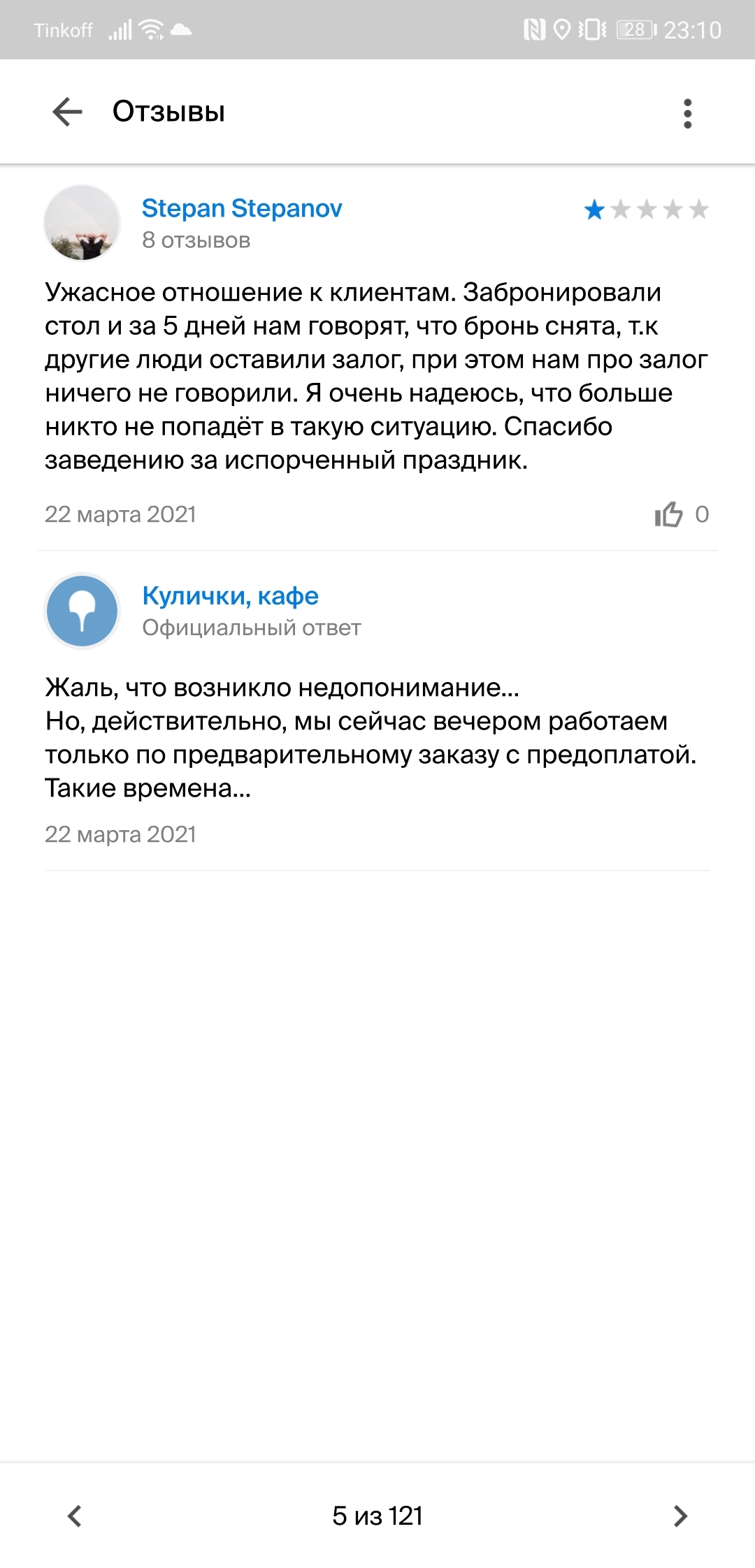 На переговорах об аренде официантка немного оживилась, сказала, что предоплату можно внести лишь за неделю, не раньше, записала наш номер и обещала перезвонить за неделю до банкета. И, конечно, не перезвонила. На недовольный отзыв в 2гисе отвечают хамством, и я такая не одна...