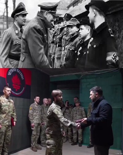 ▪️Напомним, что также в серии фото Зеленский награждает нацистов, на шевронах которых эмблема СС рядом трезубцем.