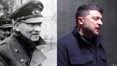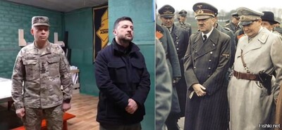 ▪️На кадрах поездки якобы в направлении Мирнограда Зеленский награждал боевиков 4-й бригады быстрого реагирования Нацгвардии Украины, на первом же фото он стоит на фоне флага с эмблемой гитлеровской дивизии СС.
