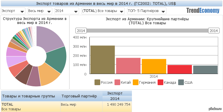 crowlyiam Как Армения экономически зависит от России? Очень сильно 10 лет назад В Россию продаются руды, золото и алмазы, алкоголь, черные металлы, алкоголь. Источник: http://trendeconomy.com/ru/trade/Armenia/Export/World/2014/H2/H2TOTAL Армения Россия Торговля