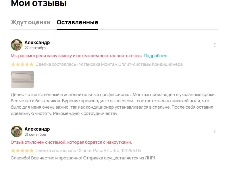 Захотел поставить сплит себе. Порылся на авито. Нашел человека. Написал ему 16 сентября с запросом на установку. Долго и продуктивно общались в переписке(полный доступ к ней у авито есть) аж две недели, я задавал кучу вопросов - он грамотно и спокойно отвечал. В итоге установку назначили на субботу 27 сентября. Человек приехал - все установил идеально. За собой убрался. Короче все отлично.