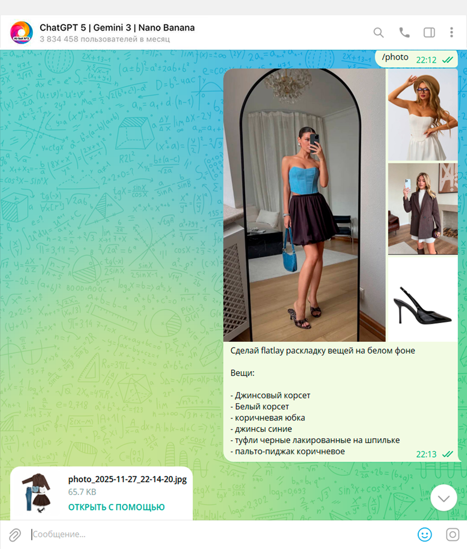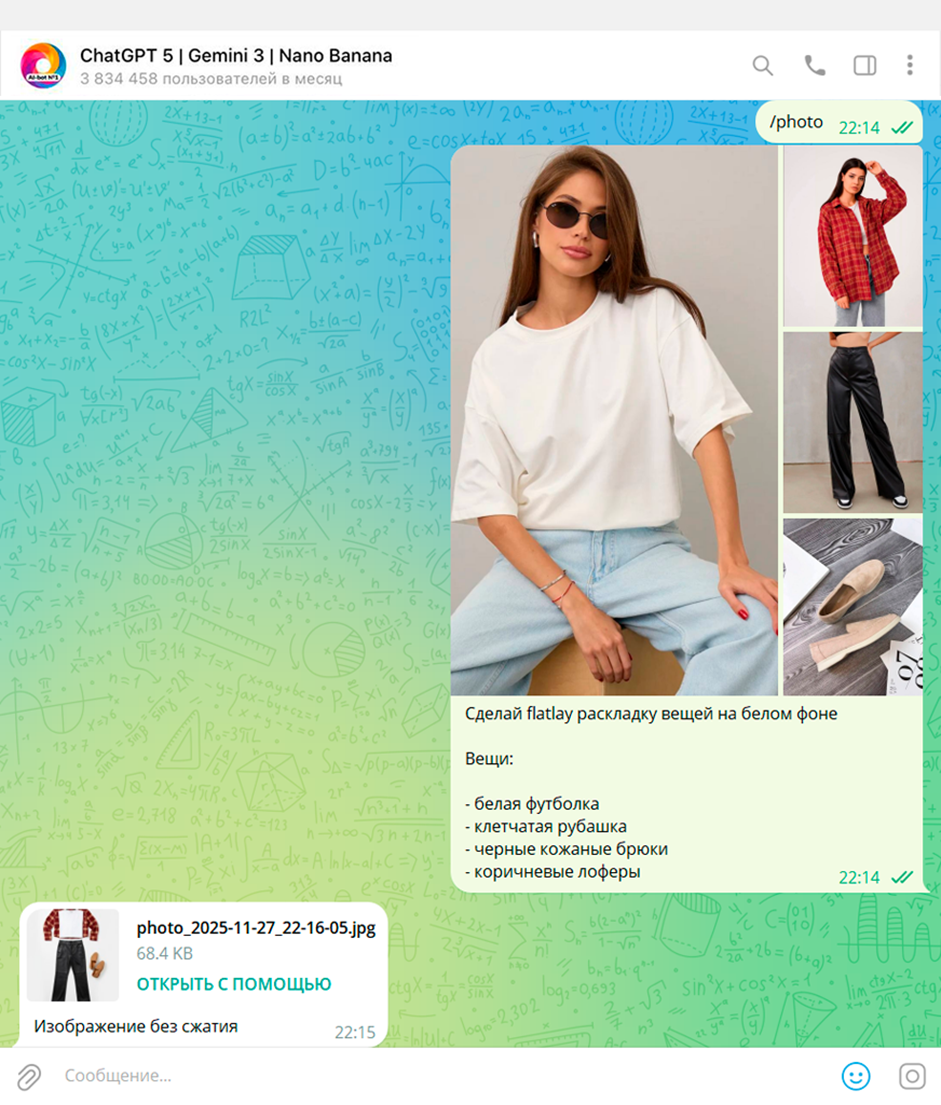 Что можно сделать: сфотографировать вещи (или просто кинуть фотку с маркетплейса) — и боту хватает нескольких секунд, чтобы разобрать, что там есть. Потом сделать аккуратную раскладку.