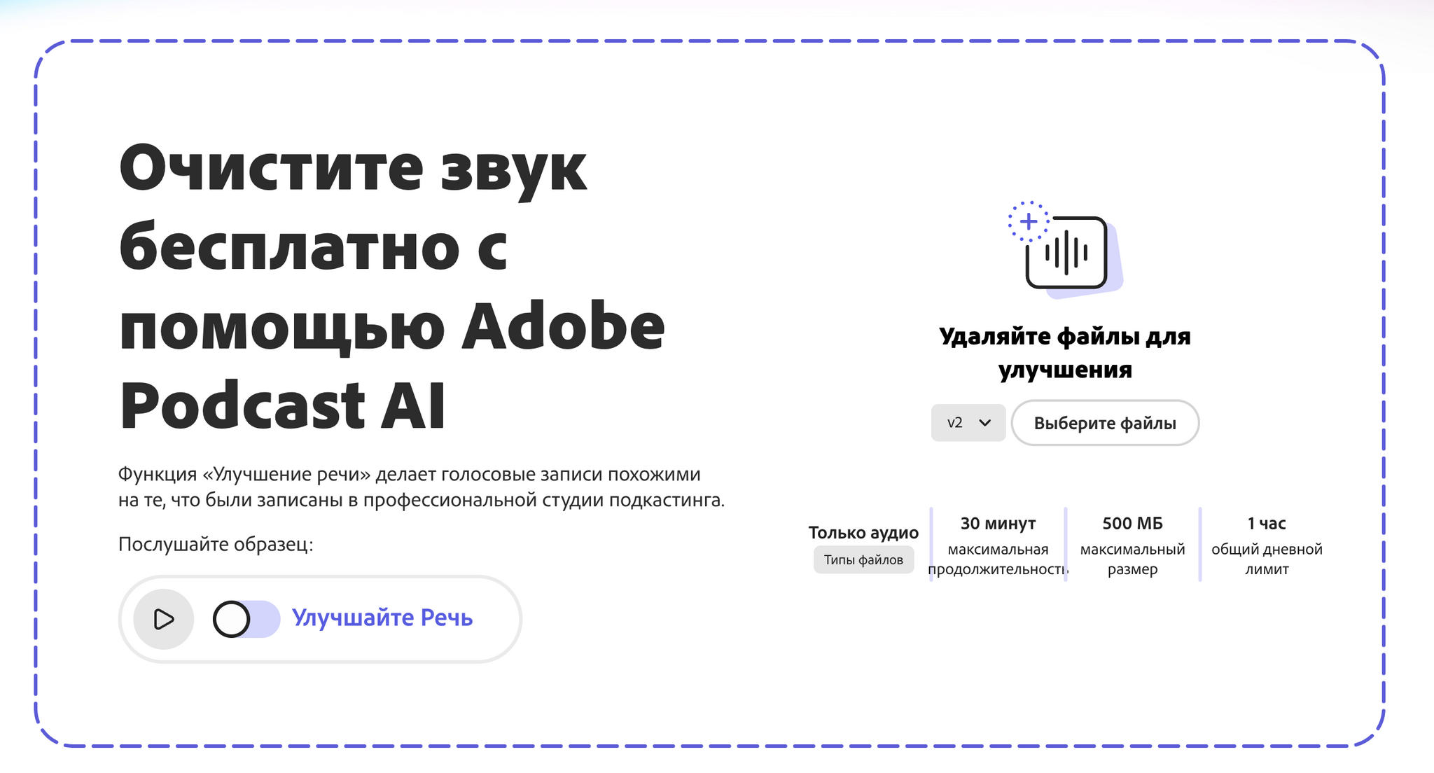 Adobe Podcast AI — улучшает голос, делая его похожим на запись в профессиональной студии.