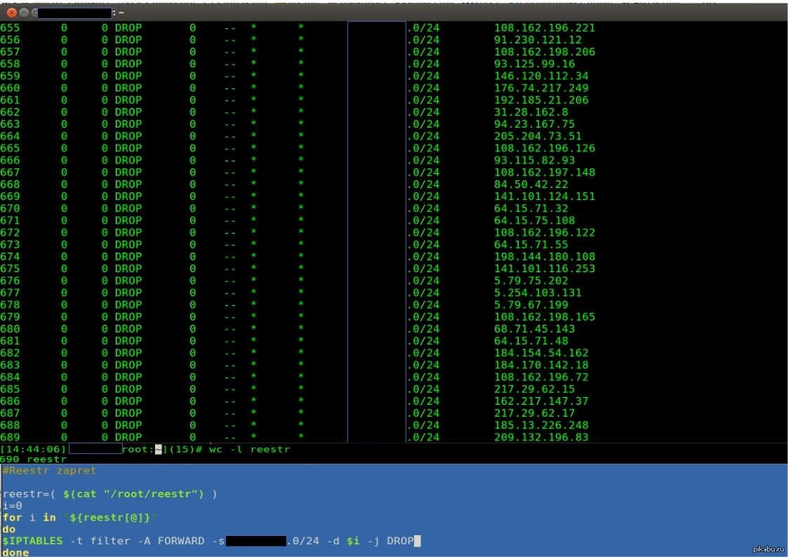 129 glomzy Как блокируются сайты по "реестру запрещенных сайтов". 12 лет назад Так как оборудования нет, чтобы блокировать попакетно - блочим по ip. В списке уже 690 адресов. Просто подумал, что это может быть интересным. [моё] Реестр запрещенных сайтов Блокировка Iptables Linux
