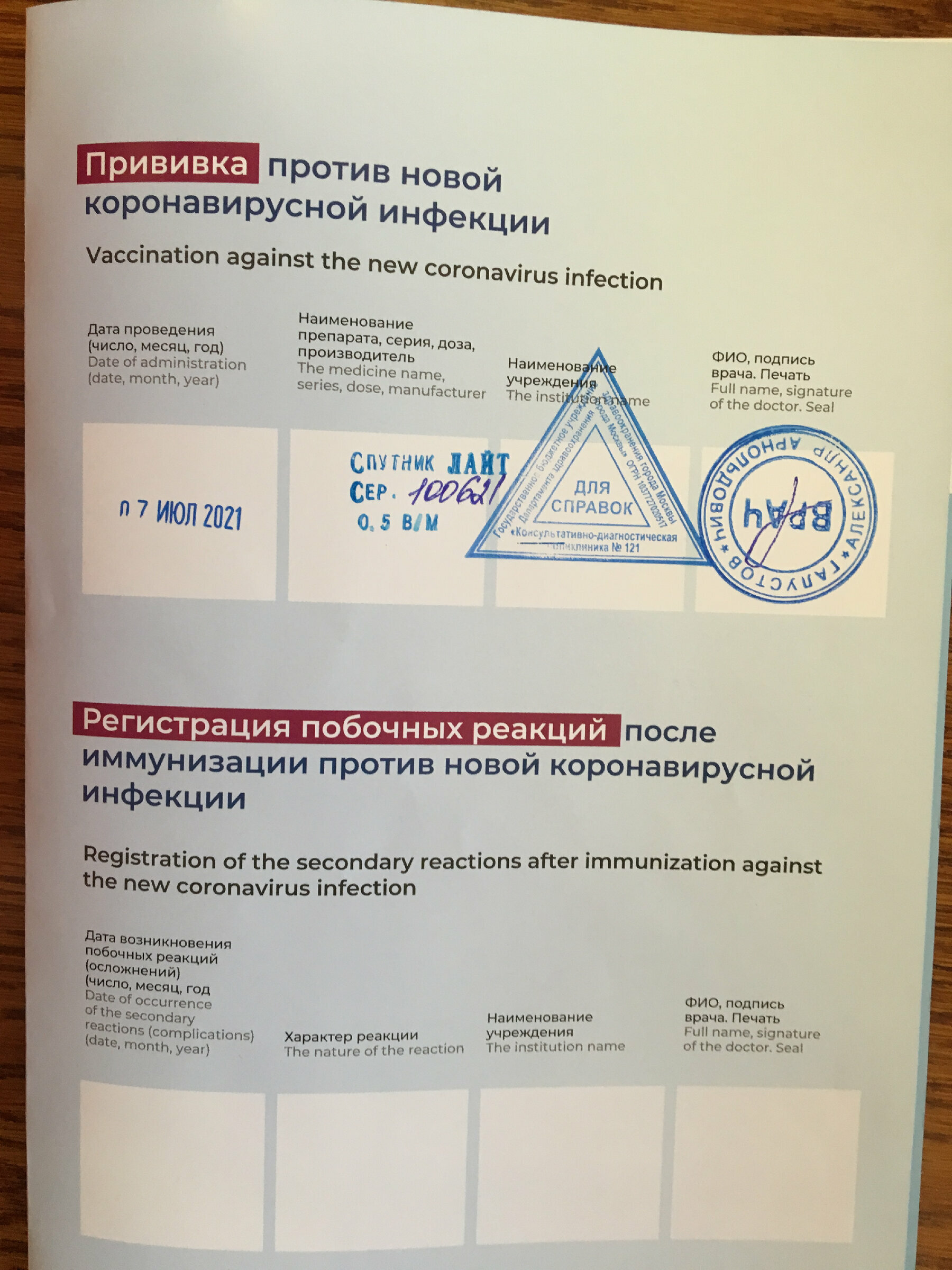 Впервые привился полным Спутником в конце прошлого года и начале нынешнего. Подробнее тут.