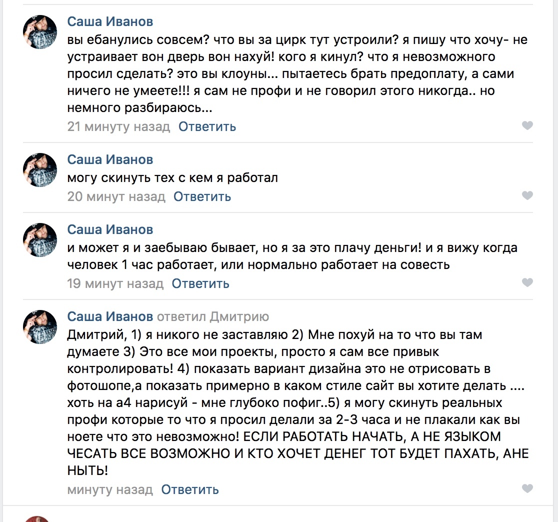 И тут я понял, что он реально ленивая шкура, которая берет предоплату, разводит заказчиков, потом кидает их в черные списки различных сообществ и искренни считает себя правым.