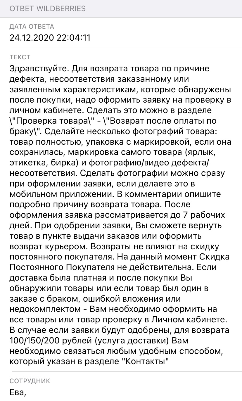 В последнее время часто сталкиваюсь с различными проблемами при заказе товаров с Wildberries. То в правилах нет ответа на возникающие у меня вопросы, то в логистике у них сбои, и я в подвешенном состоянии остаюсь. По этим проблемам приходится писать обращения в техподдержку в приложении. Срок ответа на обращения они сами установили в 24 часа. Как это происходит на самом деле: ты пишешь первое обращение, очень скоро (в течение этих 24-х часов) тебе приходит ответ, который состоит из цитат из их правил, надерганных на основе ключевых слов в твоем обращении. Реального ответа на вопрос не содержит. Ставим этому ответу 1 звезду с пометкой «ответ на вопрос не получен», клепаем новое обращение (скопировать текст из старого эти замечательные люди не дают), ждем. Второй ответ приходит уже по существу, как правило, но не всегда)) и ждать его вполне можно несколько дней - возможно, к тому времени уже будет неактуально. Но хоть на будущее ответ получите) вот мои примеры общения с их ТП.