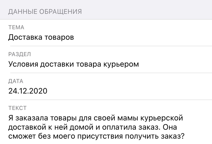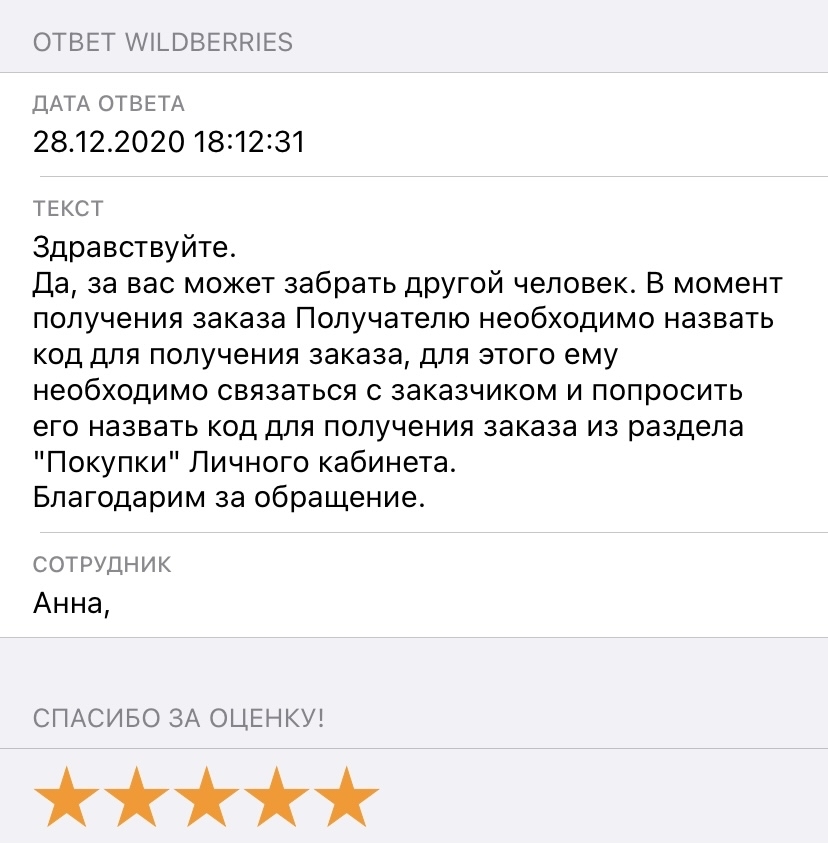 как видно, ответ на второй вопрос я получила через ЧЕТЫРЕ!! дня. К тому моменту заказ уже был получен моей мамой - у нее даже код не спросил курьер, только фамилию. Мама назвала свою (у нас разные), курьера этот вариант не устроил, тогда она назвала мою - и он отдал товар))