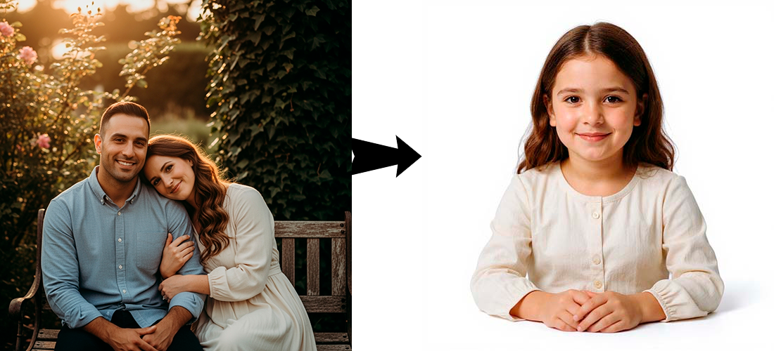 «Используя лица людей на фотографии, сгенерируй внешность их общего ребёнка и выведи результат на белом фоне (только ребёнок, без родителей)».