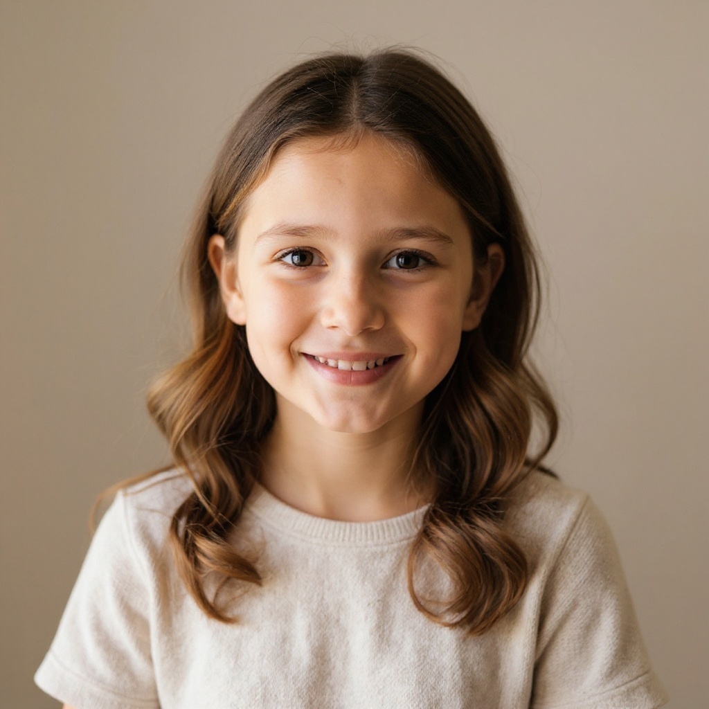 Using the faces of people in the photo, generate the appearance of their common child and display the result on a white background (only the child, no need for the parents)