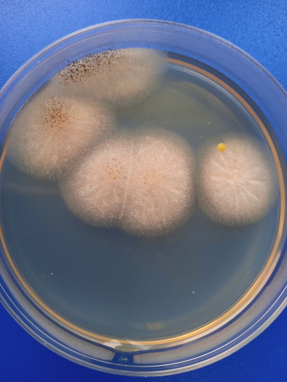 На контрольной чашке можно заметить два конкурирующих вида микроорганизмов: плесень с черными головками и белые блямбы. Ещё что-то желтое слева внизу выросло. Буду рада, если микробиологи подскажут, что это могут быть за организмы.