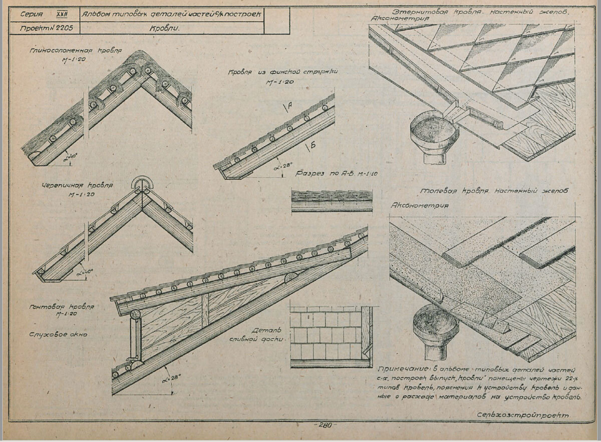 Крышу делали из соломы, гонта, стружки, но уже использовали такие материалы как толь (рубероид) и этернит (фиброцемент).