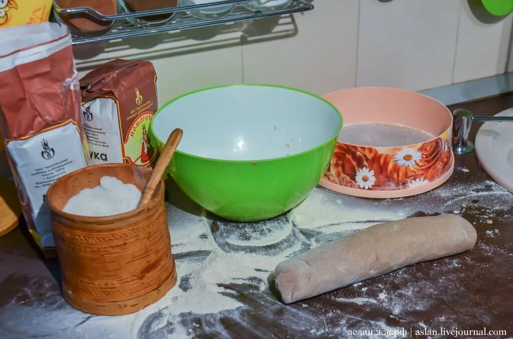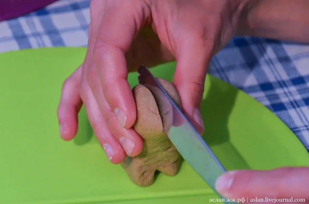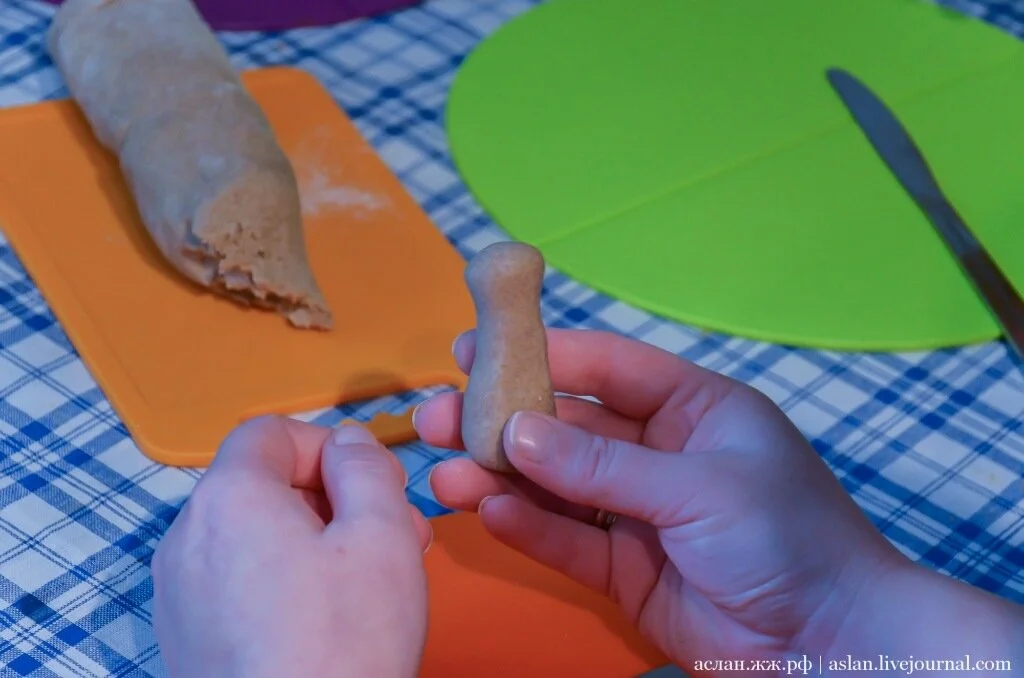 Сегодня мы будем делать именно поморские козули, в виде фигурок. Наше тесто уже готово, оно довольно крутое, плотное, не прилипает к рукам. Нужно отщипнуть от него небольшой кусочек и раскатать в руках.