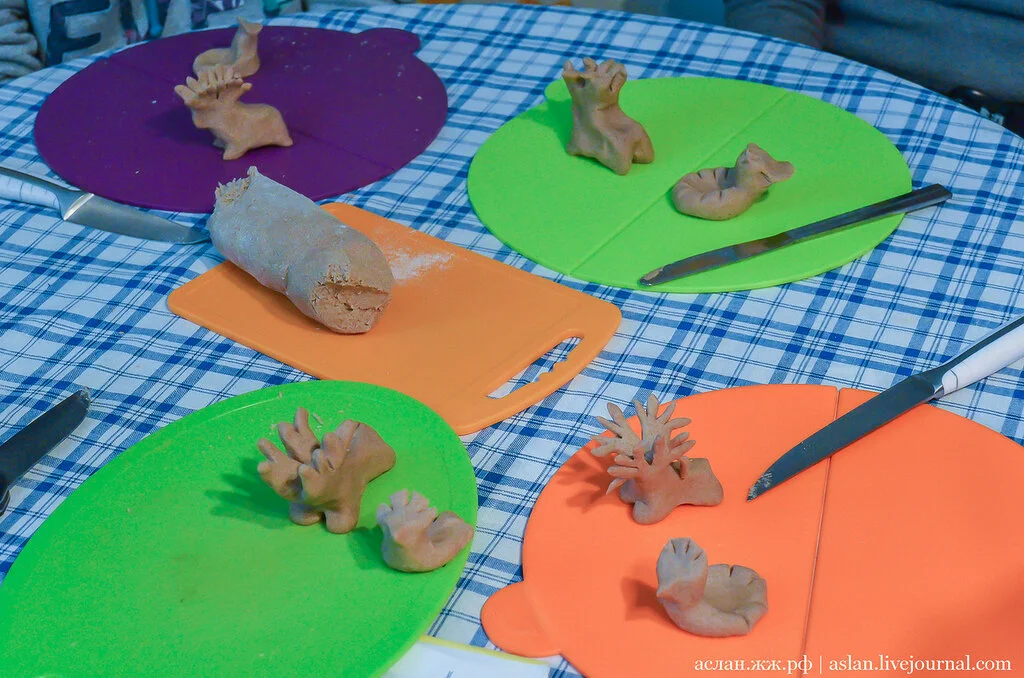 Для этого аккуратно ножом формируем ноги и разделяем голову пополам, чтобы сделать ветвистые рога. Каждая фигурка, должна быть со смыслом.