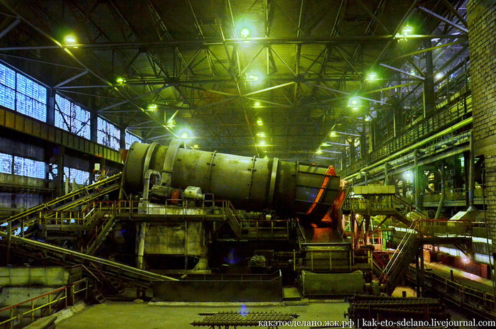 Процесс изготовления окатышей часто называют "окомкование". Шихта, то есть смесь тонко измельчённых концентратов железосодержащих минералов, флюса (добавок, регулирующих состав продукта), и упрочняющих добавок (обычно это бентонитовая глина), увлажняется и подвергается окомкованию во вращающихся чашах (грануляторах) или барабанах-окомкователях. Они самые на снимке.