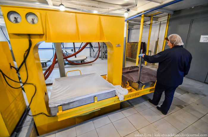 Штабель осторожно подводят под прессующую плиту поворачивая секцию на 180 градусов. Во время прессования следят за тем, чтобы не было смещения отдельных пакетов и чтобы края дренажных плит не касались друг друга, а также чтобы масса не проходила через салфетки.