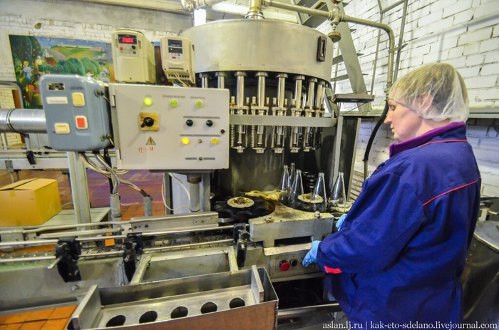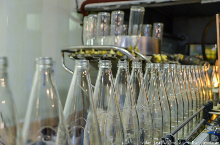 Ну а теперь посмотрим как морс попадает в бутылку. На производстве используют именно стеклянную тару, так как она дольше сохраняет полезные свойства морса. Стеклянная бутылка выставляется на конвейер, ополаскивается подготовленной водой и после прохождения парового термотоннеля поступает на разливочный автомат. Здесь дефектоскоп проверяет бутылки на наличие микротрещин.