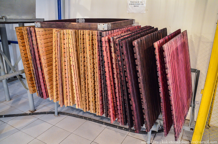 Все дренажные плиты используемые для отжима сделаны именно из березы так как это максимально нейтральный материал не влияющий на вкус напитка. Со временем дерево приобретает цвет ягод с которыми он соприкасается, но это в будущем никак не влияет на вкус соков и морсов, так как после процедуры отжима дренажные плиты тщательно моются и дезинфицируются.
