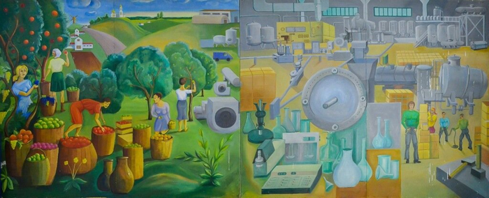 Пройдем в помещение, где приготавливается вода для морсов и нектаров. На одной из стен висит творчество местного художника, изображающего процесс сборки плодов и превращения их в соки.