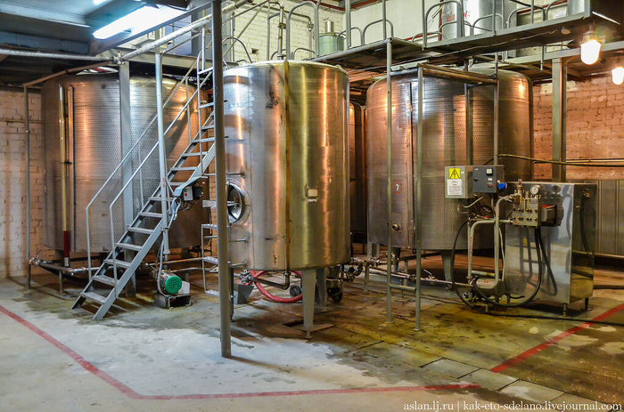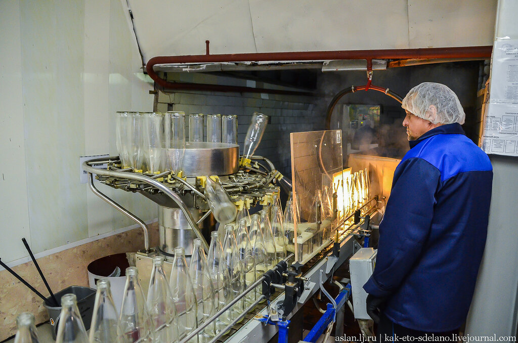 Затем бутылки по конвейеру попадают в соседние помещения, где пастеризованный продукт подается в буферную емкость, из которой напиток подается по системе трубопроводов в разливочный автомат и оттуда уже в бутылку.